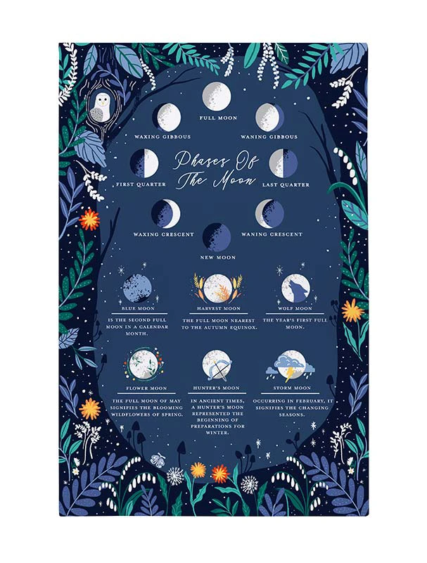 Dieses stimmungsvolle Design zeigt die Mondphasen im Laufe eines Monats mit einer stilisierten Umrandung aus Nachtfarnen, nächtlichen Käfern und einer wachsamen Eule vor einem samtig dunklen Himmel voller leuchtender Sterne.
