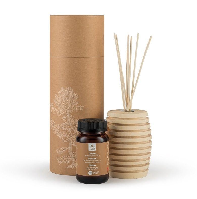 Stellen Sie die Sticks in die Flasche mit der Flüssigkeit und diese in den Behälter aus Zirbenholz. Wenn Sie keine Flüssigkeit mehr haben, können Sie eine Flasche mit der Mischung nachbestellen.