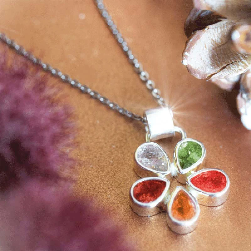 Der Turmalin wird ehrfürchtig als der Stein der Heilung und spirituellen Kraft betrachtet. Seine Verbindung zur Meditation, Weisheit und Mystik verleiht ihm eine Aura der Magie. Dieser aussergewöhnliche Design-Anhänger ist ein wahres Juwel, eine kunstvolle Silberblüte, die mit den lebhaften Farben des grünen, roten, orangen und gelben Regenbogenturmalins geschmückt ist. Er strahlt nicht nur Schönheit aus, sondern verkörpert auch die kraftvolle Verbindung zwischen der Welt der Edelsteine und den tiefen spirituellen Dimensionen. Tauchen Sie ein in die faszinierende Welt des Turmalins und tragen Sie diese spirituelle Energie immer bei sich.