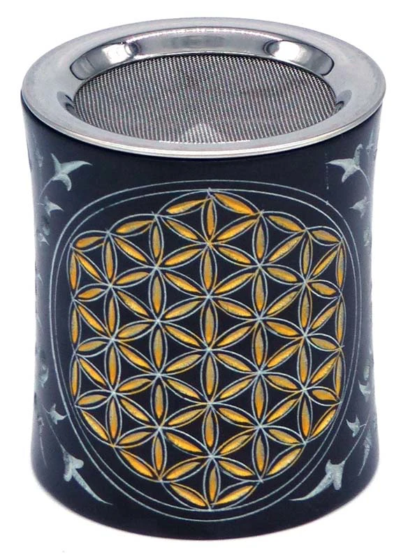 Encensoir Fleur de vie or, pierre noire Ø9 cm (Ø7,5 cm intérieur) x10 cm avec tamis