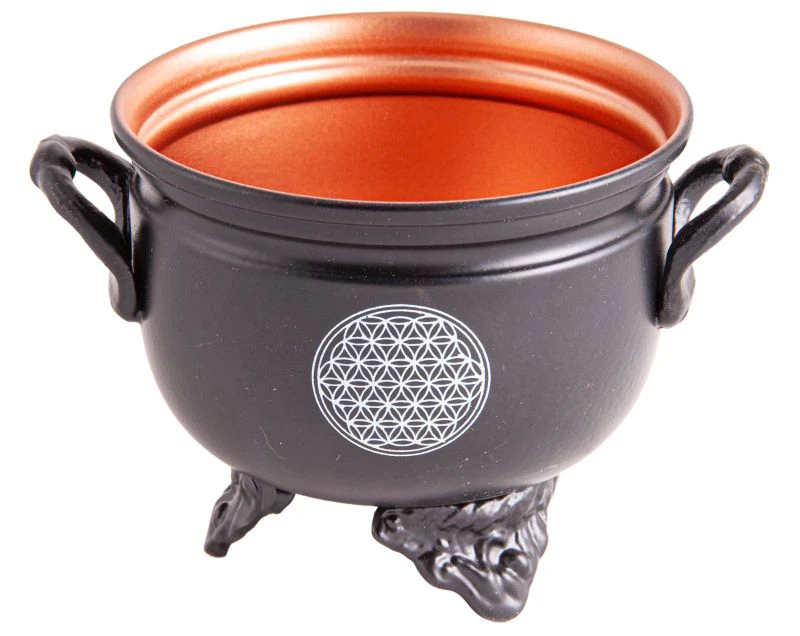 Der leichtere Hexenkessel mit zauberhaftem Charme. Das Gold bzw. Kupfer im Inneren verleiht der Räucherung etwas Mystisches. Das filigrane Symbol ist zweifach auf dem Gefäss, jeweils zwischen den Henkeln.