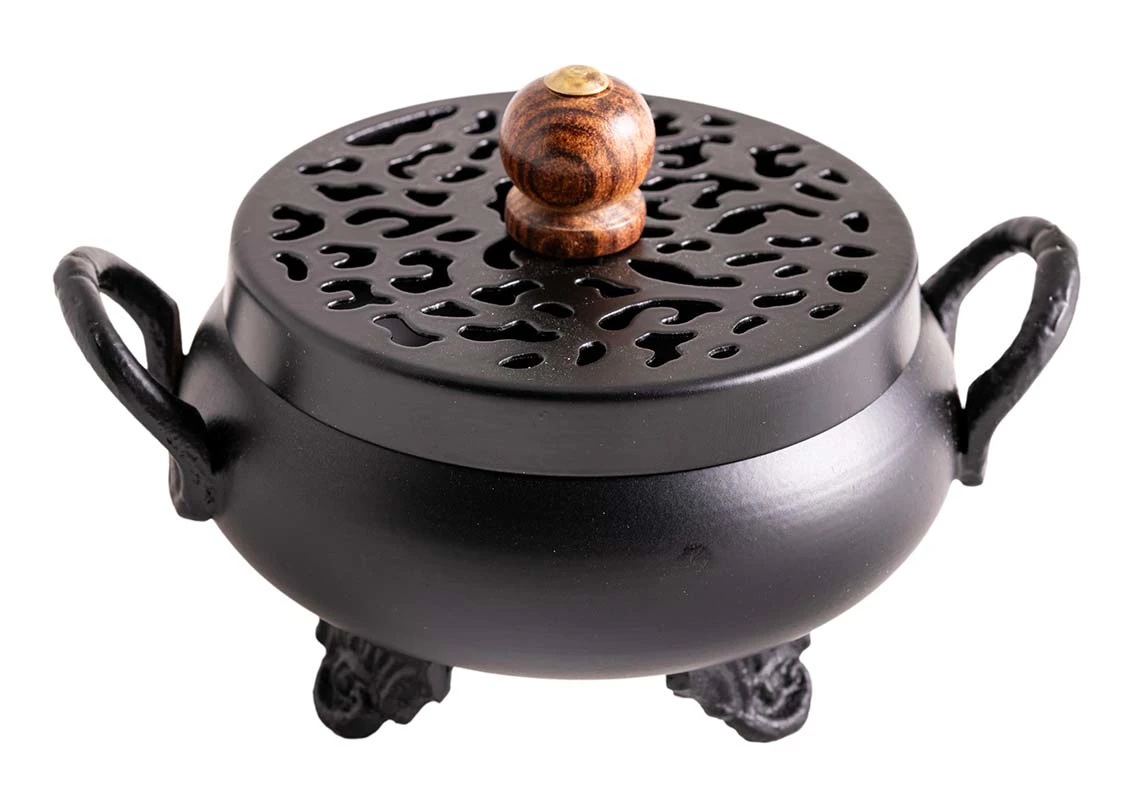 Klassisches Räuchergefäss mit Deckel und zwei Griffen aus Eisen schwarz gepudert. Bitte auf Sand räuchern.