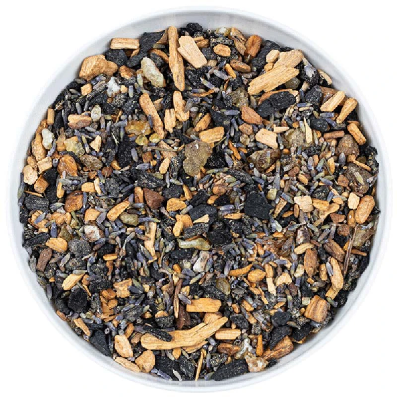 Inhaltsstoffe: Palo Santo aus Peru, Styrax, Maydi Weihrauch aus Somalia, Lavendelblüten bio.