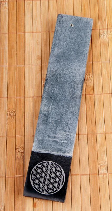 Stilvoller Specktsteinhalter mit eingelaserter Blume des Lebens. Für zauberhaftes Ambiente und energetisierende Räucherungen. Die Blume des Lebens mit ihren 19 Kreisen ist ein starkes Schwingungssymbol, welches ein absolut harmonisches, schwingendes Feld erzeugt.