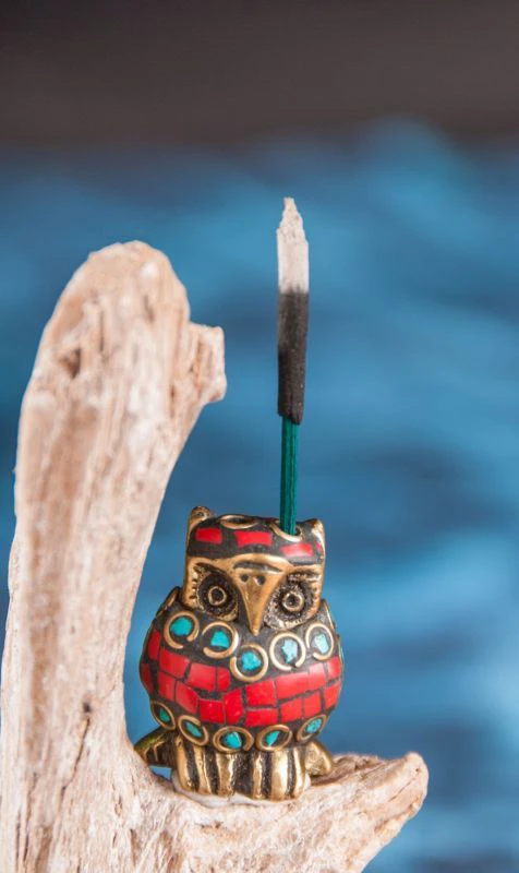 EuleSüsse, kleine Tierfigur als Räucherstäbchenhalter aus schwerem Messing mit bunten Steinchen besetzt. Wenn man das Tierchen auf einen Teller setzt, fällt auch garantiert keine Asche daneben.