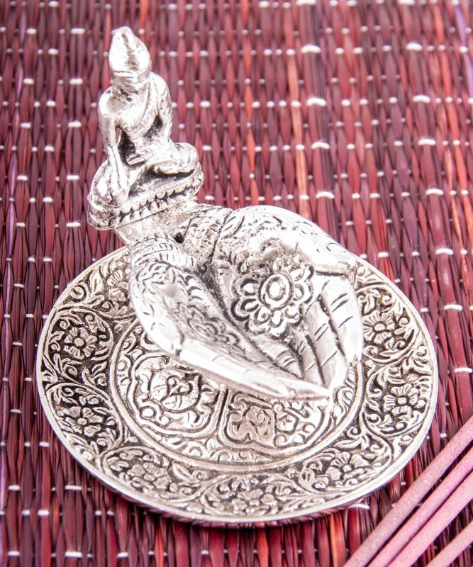 Süsser Räucherstäbchenhalter aus Weissmetall - Gebende HändePraktisch, abwaschbar, mit dem Segen Buddhas und Ganeshas.Weissmetall, ø 9 cm