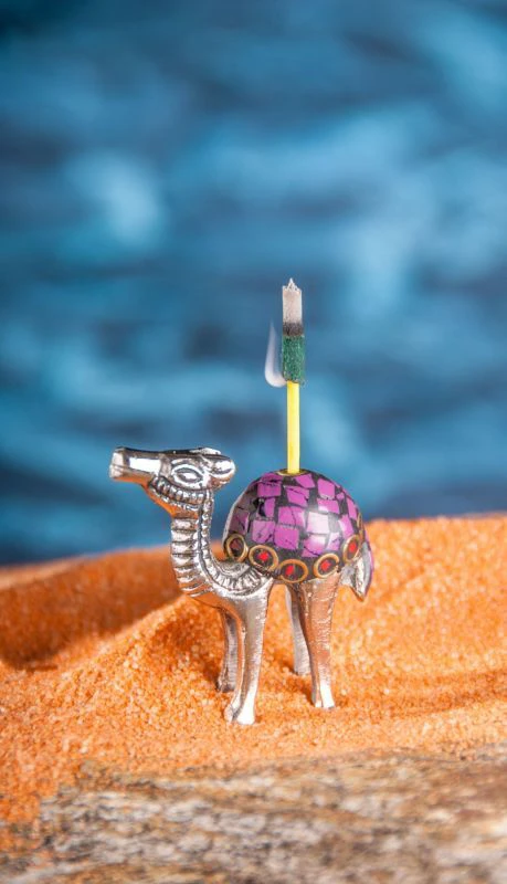Kamel, versilbertSüsse, kleine Tierfigur als Räucherstäbchenhalter aus schwerem Messing mit bunten Steinchen besetzt. Wenn man das Tierchen auf einen Teller setzt, fällt auch garantiert keine Asche daneben.