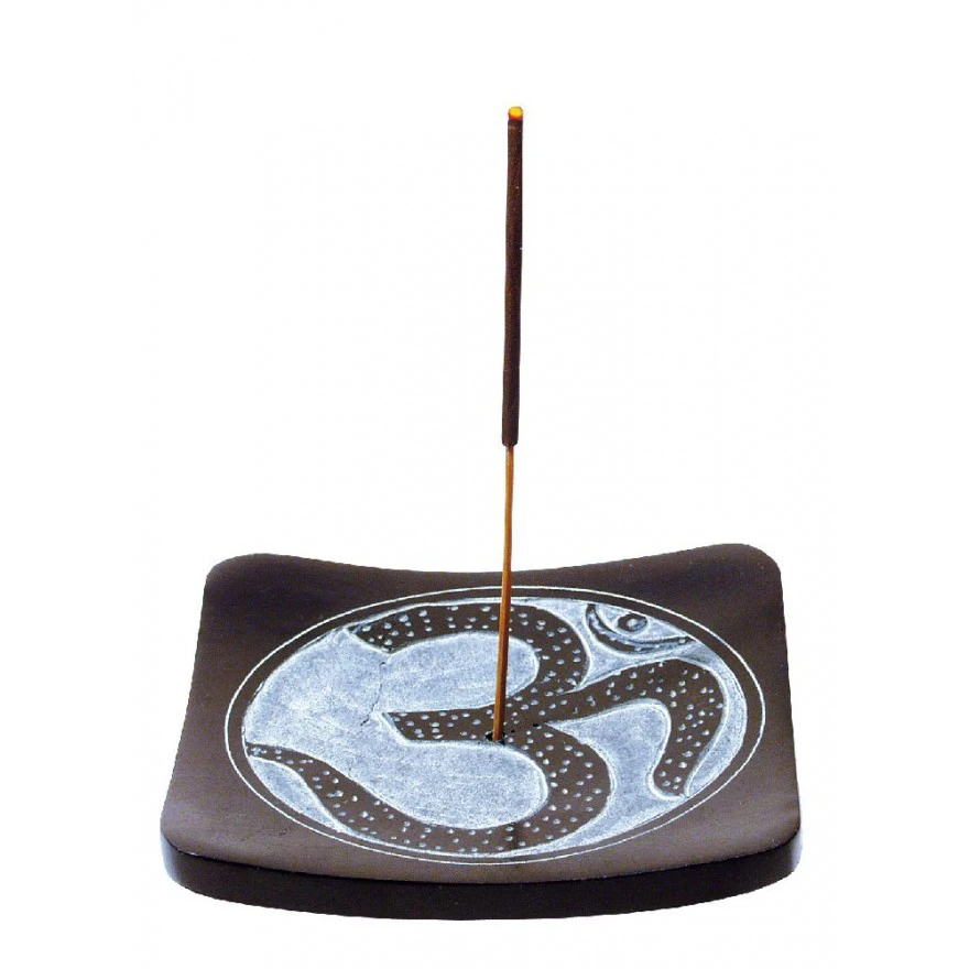 Dieser Räucherstäbchenhalter aus schwarzem Stein ist mit dem eingraviertem OM-Symbol verziert.