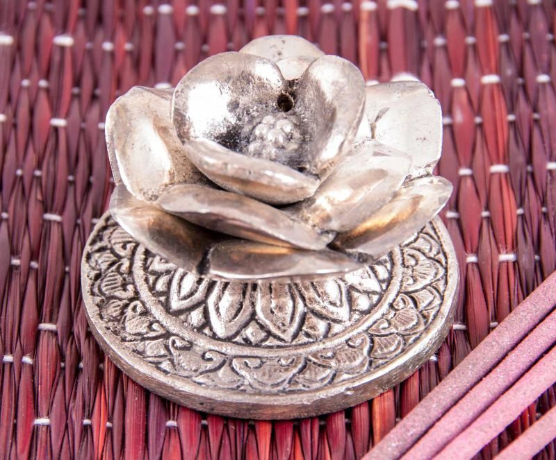 Süsser Räucherstäbchenhalter aus Weissmetall - RosePraktisch, abwaschbar, mit dem Segen Buddhas und Ganeshas.Weissmetall, ø 5 cm