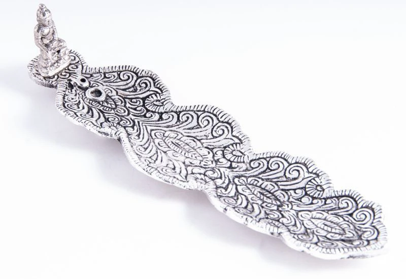 Süsser Räucherstäbchenhalter aus Weissmetall - Wirbel BuddhaPraktisch, abwaschbar, mit dem Segen Buddhas und Ganeshas.Weissmetall, L: 21 cm