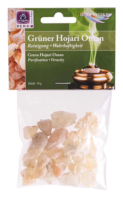Der Grüner Hojari gilt als Königsweihrauch unter allen Weihrauchsorten. Dieser Weihrauch verbreitet einen geradezu himmlischen Duft. Er klärt die Atmosphäre und zieht unseren Geist in kosmische Gefilde. Alles Schwere wird losgelassen, alle Anhaftungen gelockert und man beginnt wieder sich selbst und die eigene unbändige Kraft und Energie zu spüren. Er führt uns zu unserem wahren Weg und gibt die Kraft, ihn mit Wahrhaftigkeit zu gehen. Wer ihn einmal geräuchert hat, möchte ihn nicht mehr missen.