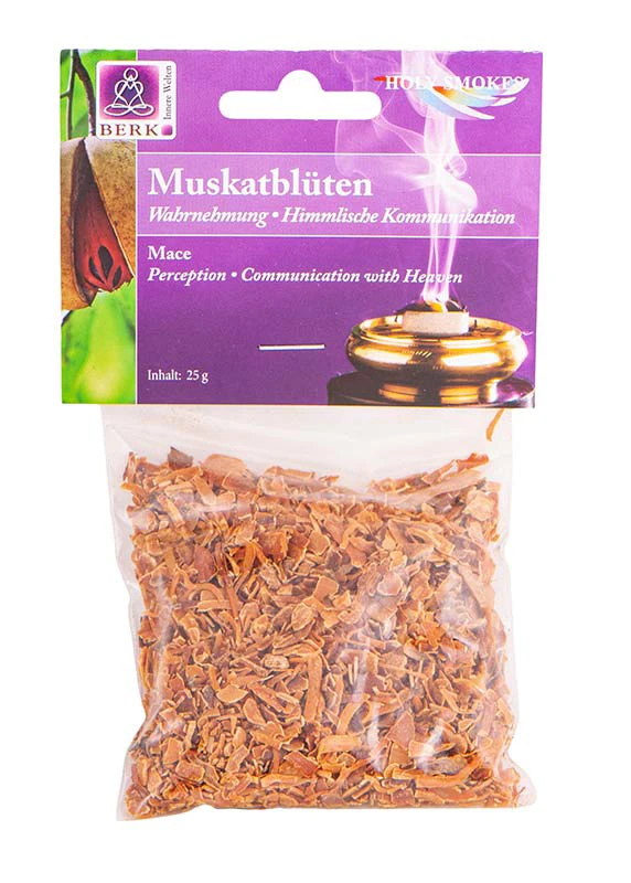 Muskatblüten gehören zu den magischen Pflanzen. Sie besitzen bewusstseinserweiternde, klarsichtige, visionäre Eigenschaften. Muskatblüten werden beim Räuchern nur sparsam und meist in Mischungen mit anderen Pflanzen angewendet. Sie eignen sich hervorragend für Orakelräucherungen, Visionsräucherungen aber auch für Konzentrationsräucherungen.
