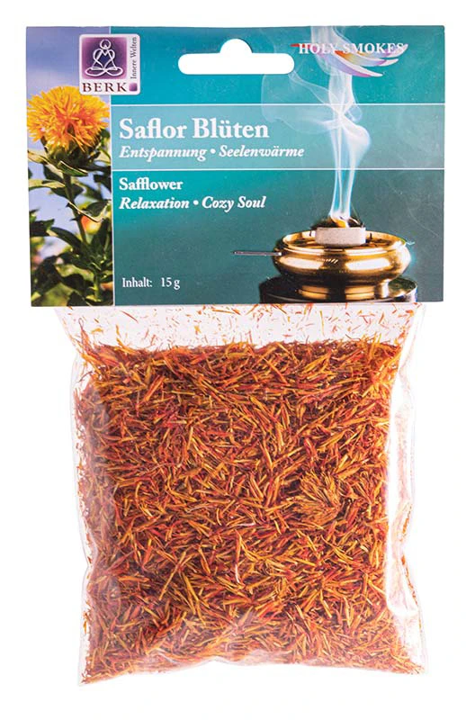 Auch falscher Safran genannt. Saflorblüten entwickeln beim Verräuchern einen safranartigen, orientalisch feinen Duft. Saflor wärmt unsere Seele und wirkt ausgleichend und beruhigend. Er wird gerne für Weihungen bzw. Segnungen verräuchert, da er eine heilige, reine Atmosphäre schafft.