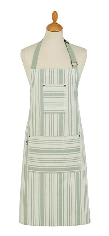 Ein mehrfarbiger gewebter Streifen in Salbei-Grün und natürlichen Baumwolltönen. Ulster Weavers ist stolz darauf, diese schöne Schürze mit seinem industriell inspirierten Design in seine Kollektion aufzunehmen, das durch kleine, stilvolle Details wie doppelt genähte Kanten und Messingnieten aufgewertet wird.
