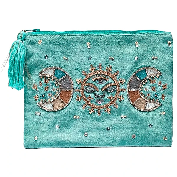Wie ein stiller Begleiter für unterwegs bewahrt dieses mintfarbene Samttäschchen alles, was Ihnen wichtig ist – von Ritualkarten bis Lippenstift, von Kristallen bis Notizen. Zarte Stickereien zeigen den Mond und die Sonne. Die weiche Haptik, die feinen Perlen und die Quaste am Reissverschluss verleihen dem Beutel eine besondere Anmut.