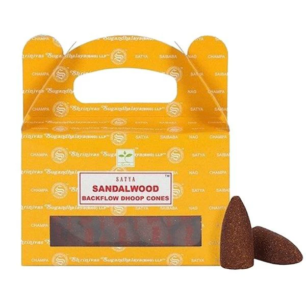 Speziell für Rückfluss-Räuchergefässe konzipiert sind diese duftenden Sai-Baba-Räucherkegel von Satya in den der Duftrichtung Sandelholz.