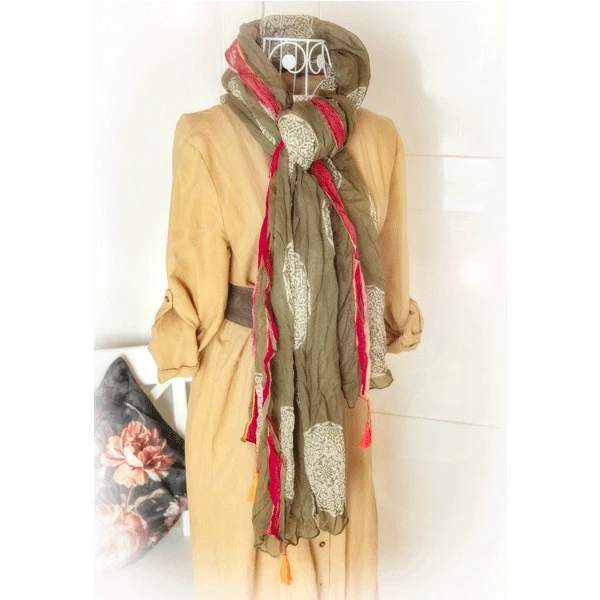 Ein besonderer Schal aus reiner Baumwolle: Der olivgrüne Grundton bringt Tiefe und Ruhe, während feine, weisse Mandalas auf der gesamten Fläche für eine harmonische Ausstrahlung sorgen. Entlang der Längsseiten verläuft eine schmale Bordüre in leuchtendem Rot – ein klarer, frischer Kontrast, der dem Schal einen modernen Akzent verleiht. Die vier farblich passenden Troddeln an den Ecken setzen spielerische Details und runden das Design ab.