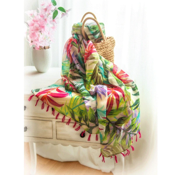 Ein lebendiger Garten in Tuchform – »Herbstgarten« entfaltet seine volle Farbenkraft in kräftigem Grün, leuchtendem Rot und zartem Violett. Das florale Muster erinnert an spätsommerliche Blumenbeete und wilde Rankpflanzen, die sich noch einmal in all ihrer Fülle zeigen. Der weiche, leichte Baumwollstoff schmeichelt der Haut, während feine Tasseln an den Enden verspielte Akzente setzen. Ob als Schal, Pareo oder kreatives Stylingelement – dieses Accessoire bringt Lebensfreude, Farbe und einen Hauch Naturverbundenheit in jede Bewegung.