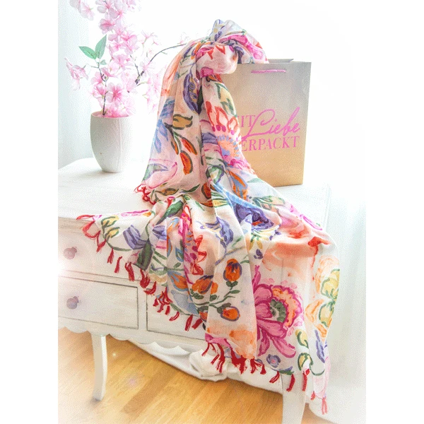 Auf einem hellen, fast wie vom Sonnenlicht durchwirkten Grund blüht »Samantha« in voller Farbenpracht – zarte, florale Muster tanzen wie ein Sommergarten im Wind. Der federleichte Stoff umhüllt dich wie ein sanftes Versprechen warmer Tage, während kleine Tasseln an den Enden spielerische Akzente setzen. Ob als luftiger Schal, Pareo oder zarter Begleiter am Meer – der Schal ist mehr als ein Accessoire: ein Hauch von Sommer, der bleibt.