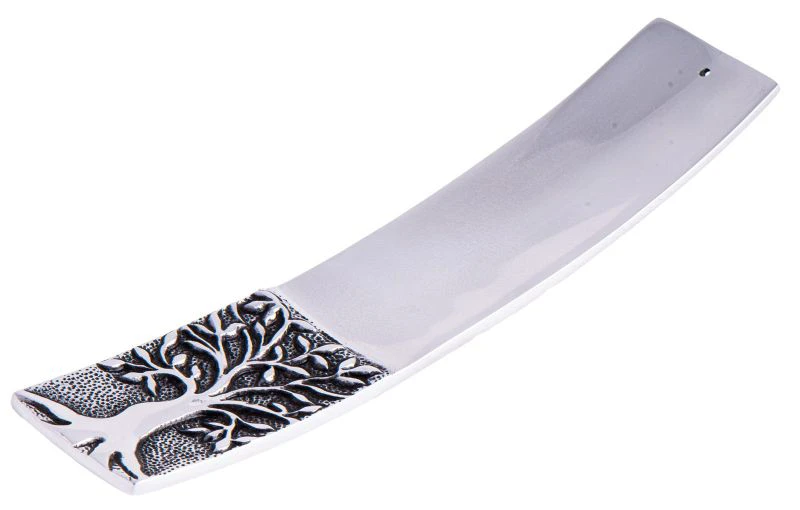 Wunderschöner, moderner Räucherstäbchenhalter mit tiefem Symbolrelief. Besonders breit, damit auch keine Asche daneben fällt. Er ist leicht gebogen, sodass sich die Enden dezent vom Untergrund abheben.