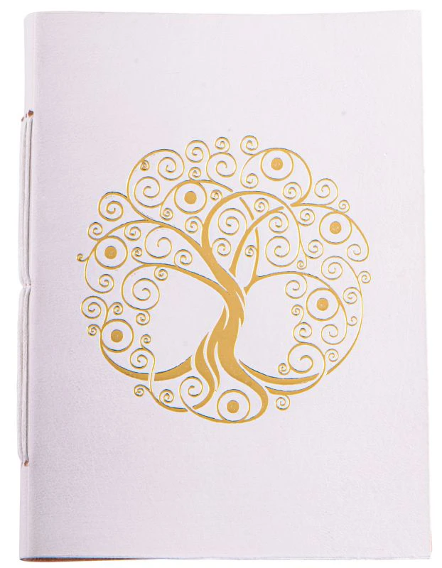 Das Schreibbuch Lebensbaum weiss/gold ist ein hübsches Notizheft. Es hat einen Ledereinband mit Goldprägung und ist aus recyceltem Naturpapier. Die Seiten sind aus einer umweltfreundlichen Mischung aus Papier und Baumwolle. Dieses Papier ist stärker als gewöhnlich und es lässt sich dennoch ganz wunderbar darauf schreiben. Ein kleiner Schatz des indischen Kunsthandwerks!