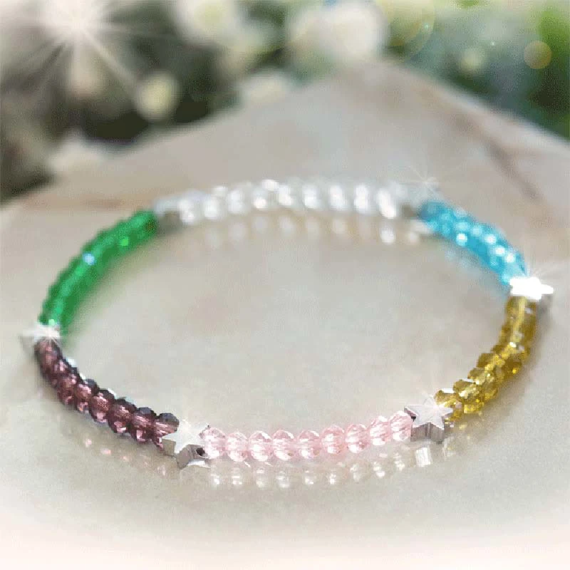Material: facettierte Schwingquarzperlen in Blau, Gelb, Rose, Weinrot, Grün, Klar. Sterne: versilberte Metalllegierung ohne Nickel, Blei und Cadmium. Da elastisch, ist es für gängige Damenhandgelenksgrößen passend.