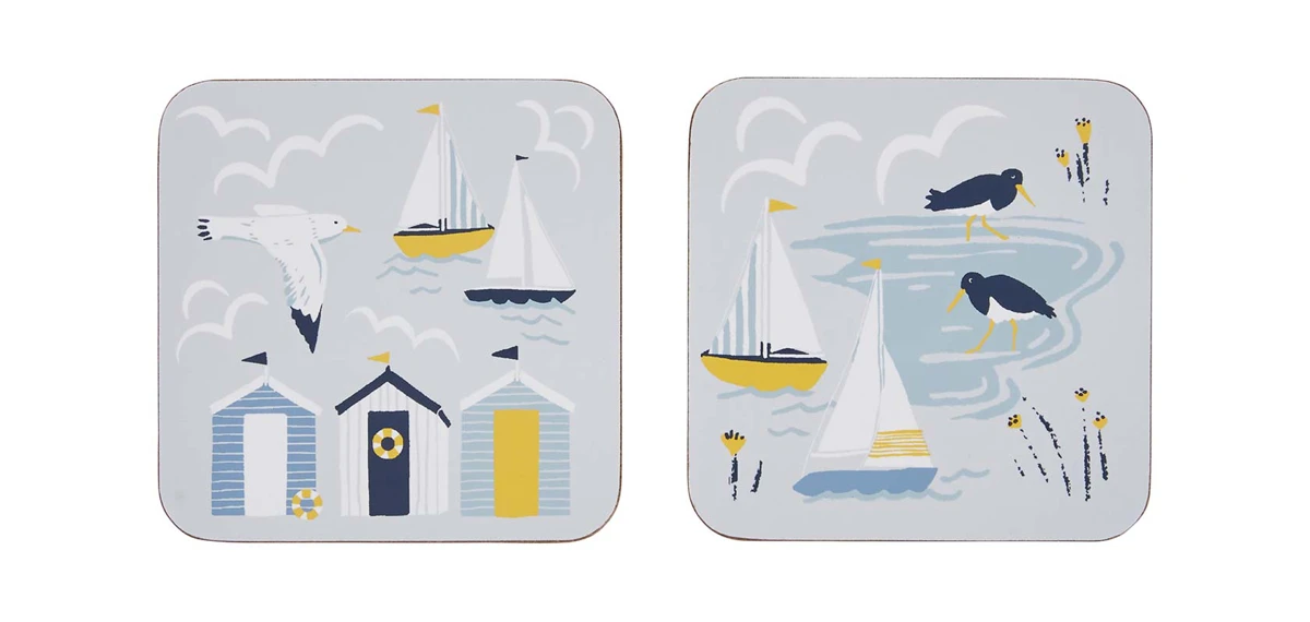 This beautiful Coaster, part of the Seashore collection, inspires new narratives around the beach with its streamlined shapes in a nautical colour palette. Traditional linocut and block printing techniques have been explored to create this design, with water ripples and cloud formations giving life and movement to contrast the static beach huts.