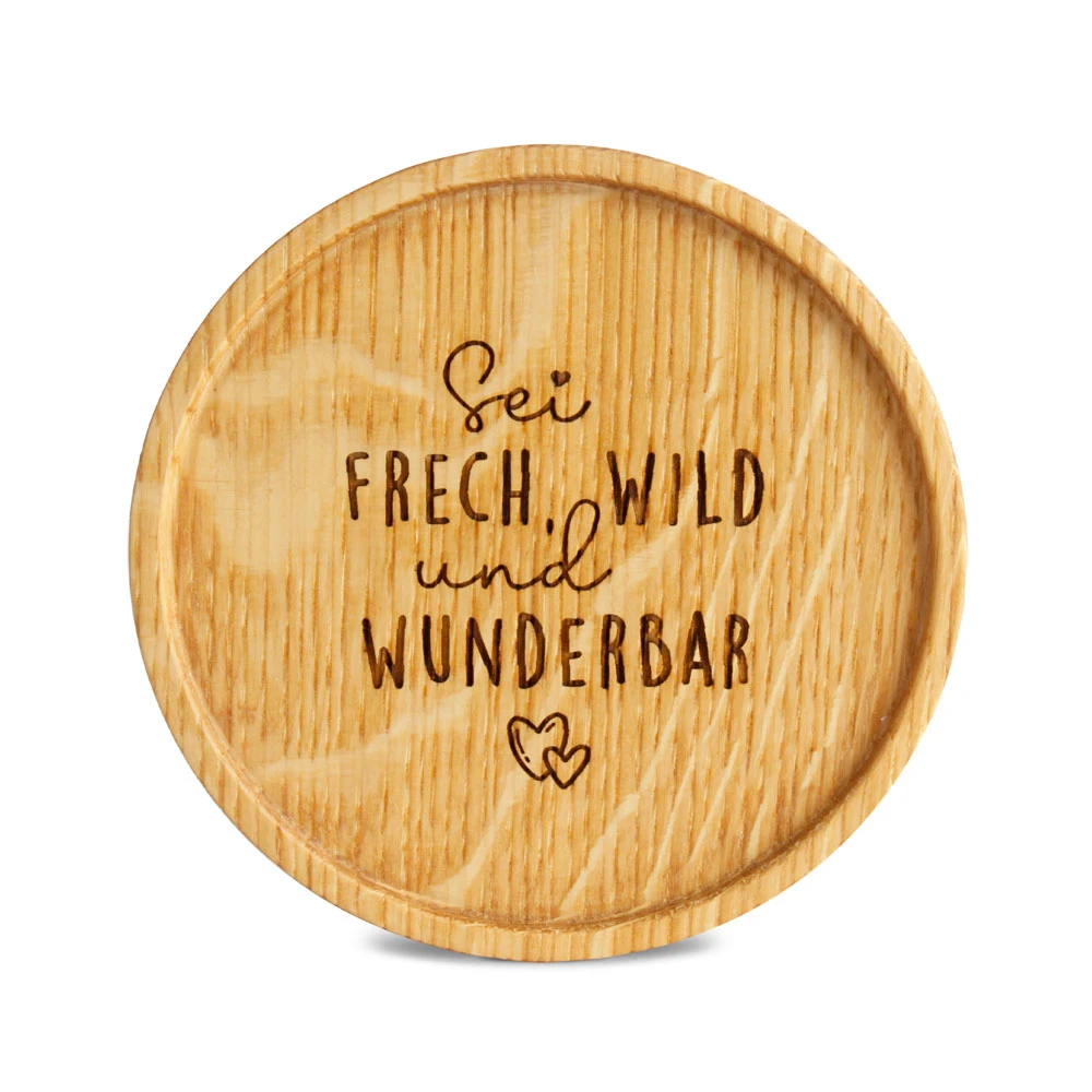 Dieser stabile Holz-Untersetzer mit der Gravur "Sei frech, wild und wunderbar" schützt Oberflächen auf stilvolle Weise vor Kratzern, Flecken und Hitzeschäden. Egal, ob für Gläser, Tassen oder Flaschen, er ist sowohl ein praktischer als auch ein dekorativer Begleiter. Die filigran eingravierten Sprüche geben jedem Untersetzer eine persönliche Note und bringen ein Lächeln auf die Lippen. Sie heißen Gäste willkommen, sorgen für eine angenehme Atmosphäre oder machen den Moment bei einer Tasse Kaffee, Tee, heisse Schokolade oder einem edlen Getränk besonders. Die natürliche Holzmaserung der geölten Eiche sorgt dafür, dass jeder Untersetzer ein Unikat bleibt – zeitlos, strapazierfähig, nachhaltig und elegant.