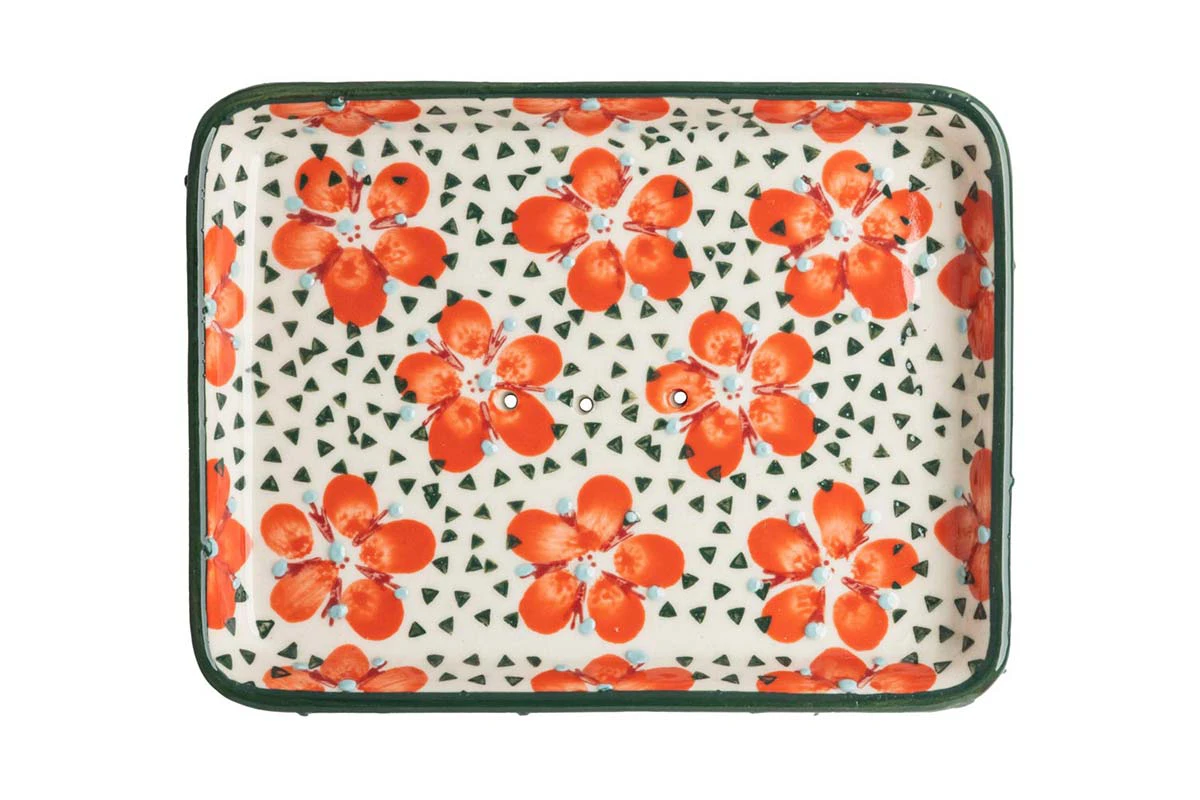Diese eckige Seifenschale aus hochwertiger Keramik ist perfekt für feste Kosmetik und Reinigungsprodukte geeignet. Dank der Abtropflöcher können Wasser und Schaum problemlos nach aussen gelangen. Die Schale wird in sorgfältiger Handarbeit gefertigt. Das hübsche Flower-Muster und die intensiven Farben sorgen für einen Hingucker und schafft eine schöne Stimmung in deinem Zuhause. Das Badaccessoire eignet sich auch ideal als Ablage für Schmuck uns Kleinigkeiten.