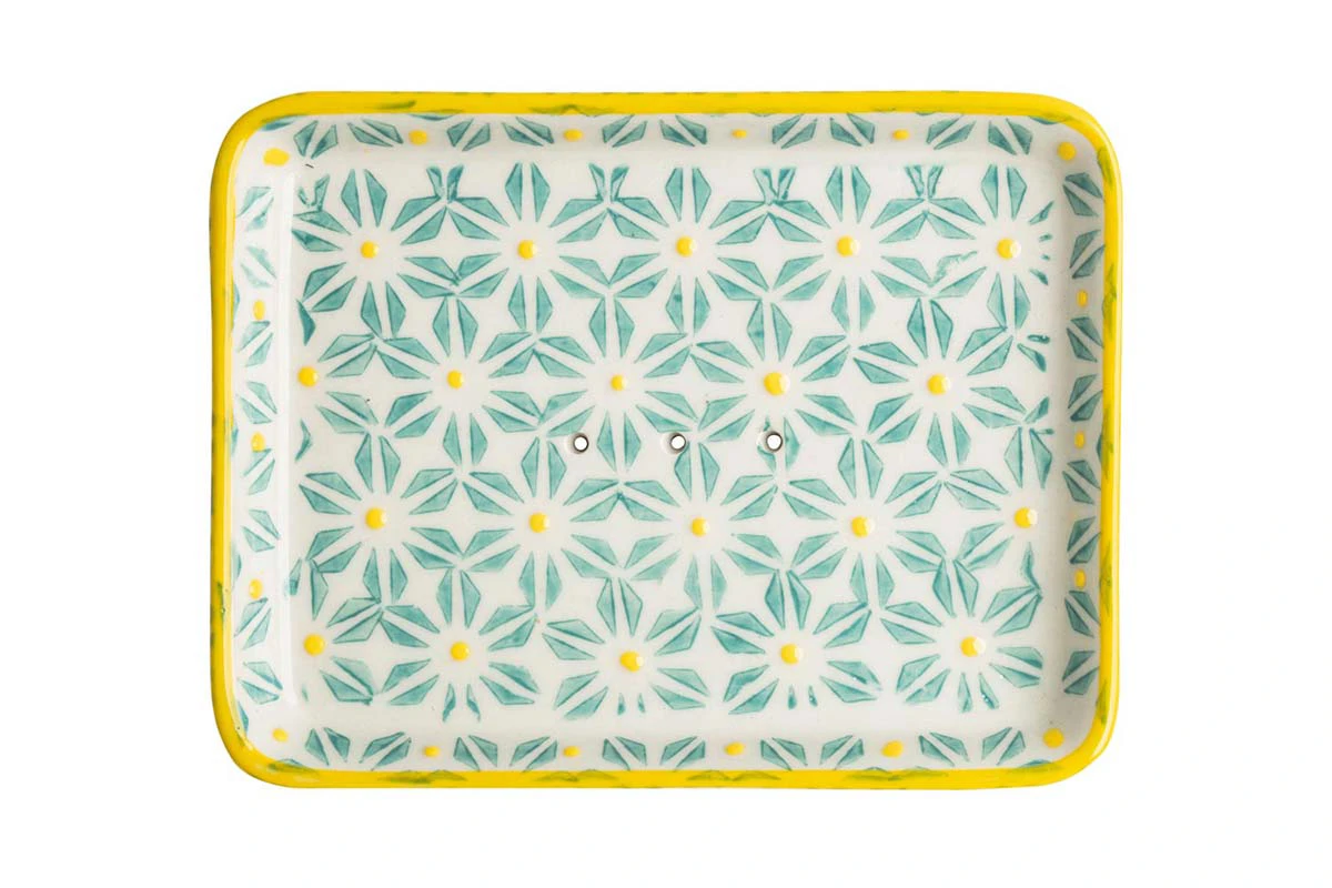 Diese eckige Seifenschale aus hochwertiger Keramik ist perfekt für feste Kosmetik und Reinigungsprodukte geeignet. Dank der Abtropflöcher können Wasser und Schaum problemlos nach aussen gelangen. Die Schale wird in sorgfältiger Handarbeit gefertigt. Das hübsche Retro-Muster und die intensiven Farben sorgen für einen Hingucker und schafft eine schöne Stimmung in deinem Zuhause. Das Badaccessoire eignet sich auch ideal als Ablage für Schmuck uns Kleinigkeiten.