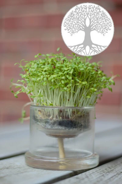 Topf sowie der Glaseinsatztrichter des Selbstbewässerungsgefässes bestehen aus hochwertigem, pflegeleichten Borosilikatglas. Verbunden wird beides miteinander über einen Viskose-Docht, der durch eine Edelstahltrennscheibe und daraufliegendem Viskosepflanzenvlies Trichter und Topf vereint. Eingesetzte Pflanzen oder aufgebrachtes Saatgut für Keimlinge und Sprossen ziehen sich soviel, des im Gewebe aufsteigenden Wassers, wie sie benötigen.