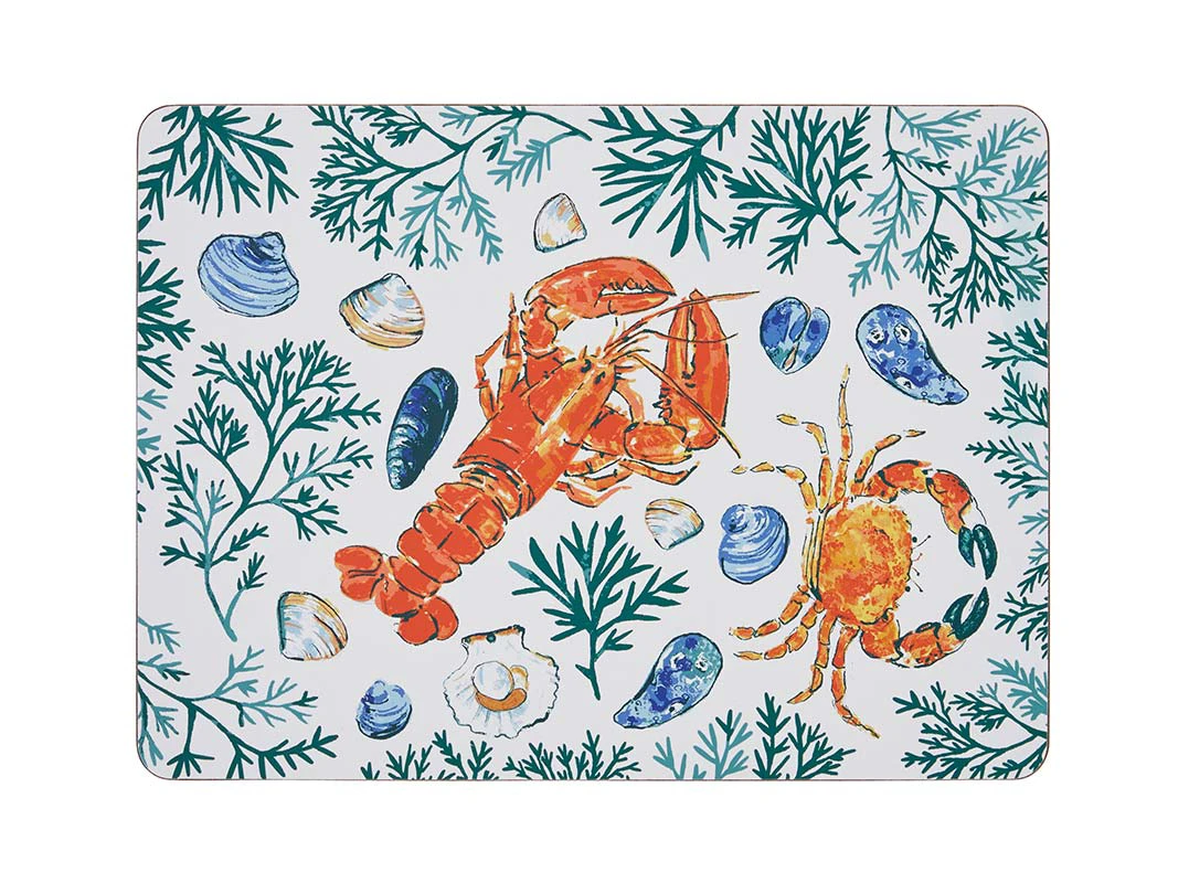 The artwork on this beautiful Placemat has been created as a contemporary mirror image, a kaleidoscope of patterns for modern kitchens and seafood lovers. The aquatic teal-green trims bring out the vibrant orange shellfish and iridescent blue mussels.