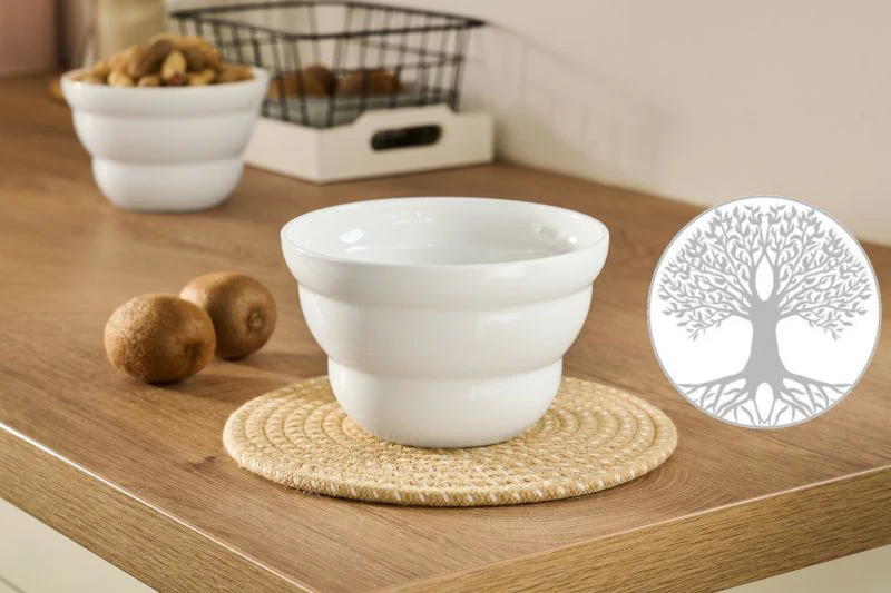 Die Schale besteht aus feinstem New Bone China Porzellan und ideal zum Genuss von Müsli, Eis, Obst, Suppen und mehr geeignet. Auf dem Schalenboden ist der Baum des Lebens in grau unter der Glasur eingebrannt.