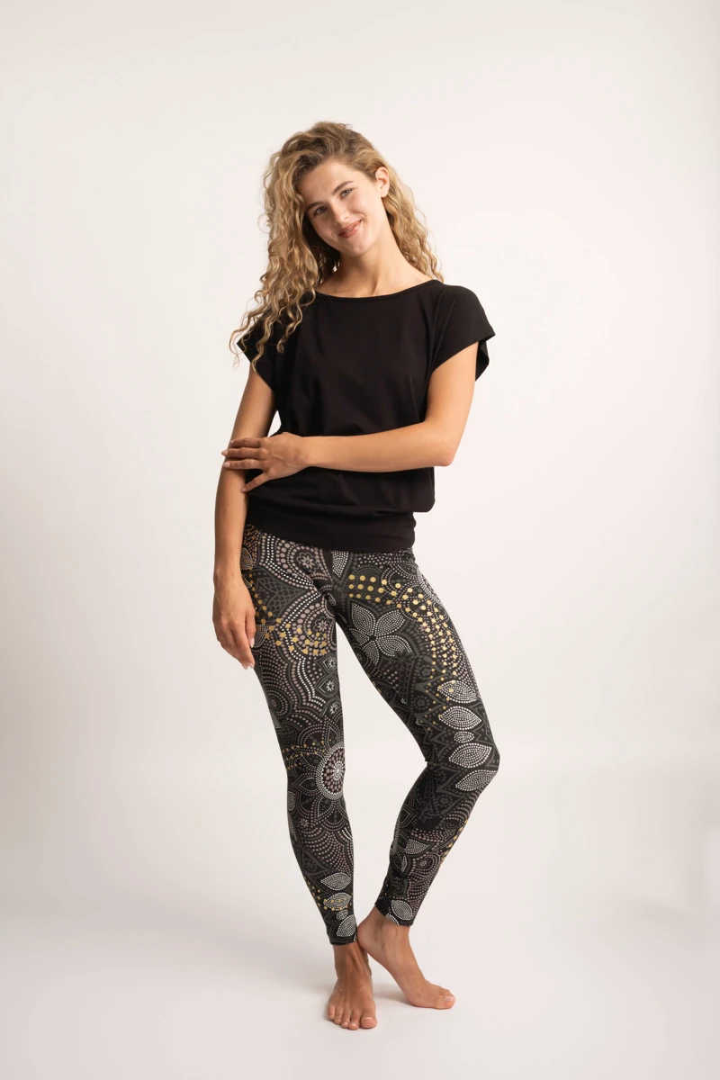 Der Name „Jangama“ stammt aus dem Sanskrit und bedeutet „beweglich“ oder „lebendig“. Diese Bedeutung spiegelt sich im Design wider: Ein raffinierter, offener Rückenausschnitt verleiht dem Shirt eine besondere Note, während ein feiner Golddruck mit Lotusblüte auf dem Rücken und ein OM-Symbol im Herz auf der Hüfte deine innere Ausrichtung unterstreichen.