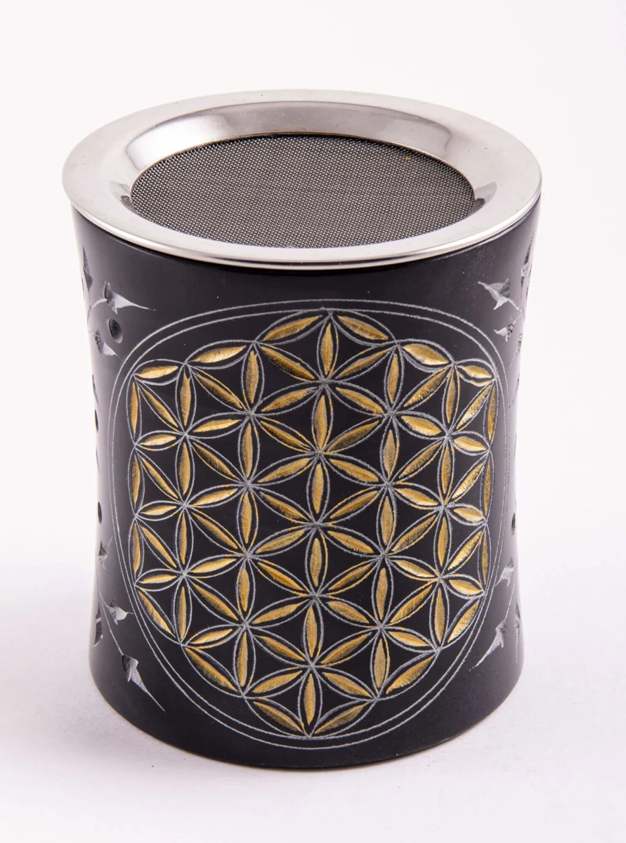 Das Siebgefäss Blume des Lebens aus Speckstein ist ein sehr edles Siebgefäss für Räucherritale. Durch die Blume des Lebens auf dem Gefäss wird die Wirkung der Räucherung noch verstärkt.