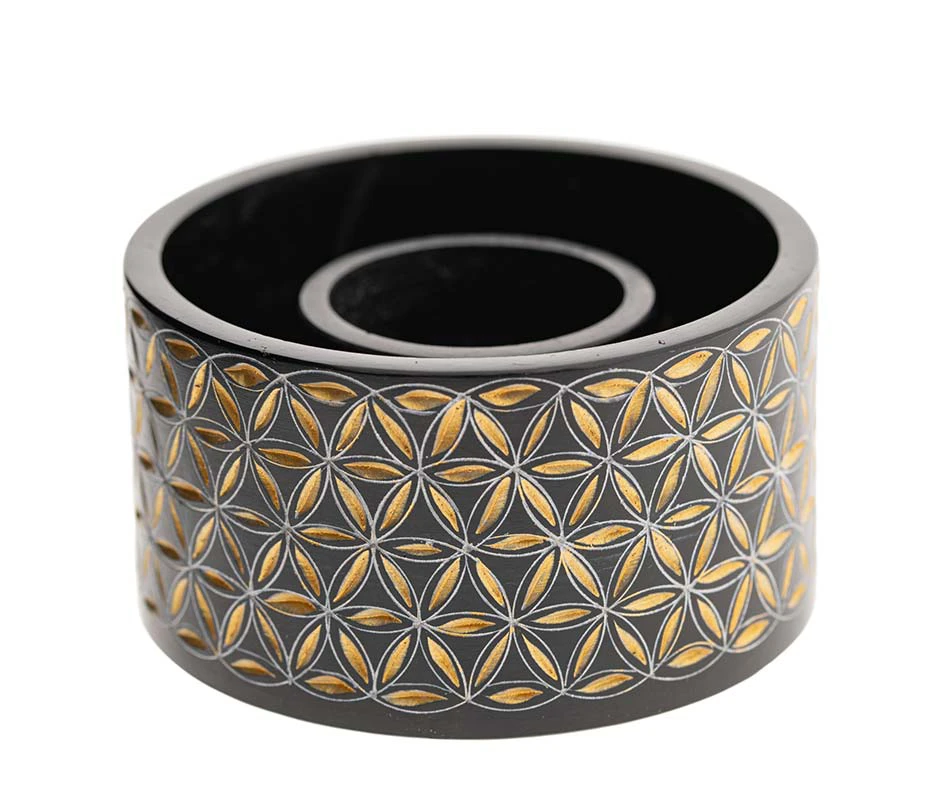 Elegante Smudge Bowl in Schwarz und Gold mit eingravierter Blume des Lebens. Die Blume des Lebens sorgt für eine hochenergetische und geschützte Räucherung.