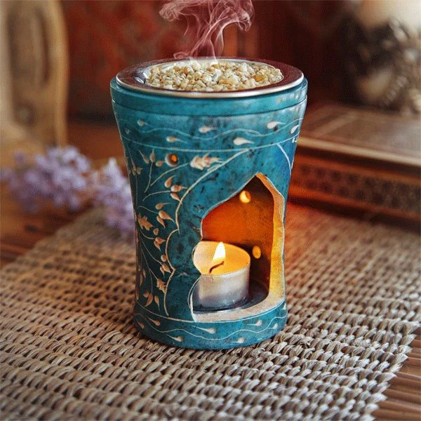 Ein wohltuender Blickfang ist dieses Räucherstövchen - allein schon durch seine Gestaltung mit den floralen Ranken und der orientalisch anmutenden Öffnung für das Teelicht. Das Kerzenlicht scheint durch kleine Löcher und verbreitet eine harmonisierende Stimmung. Sie können das Stövchen vielseitig verwenden: Verräuchern Sie Kräuter auf dem Siebeinsatz, oder verwenden Sie die mitgelieferte Schale, um Harze auf Räucherkohle zu verräuchern. Aber auch als Duftlampe können Sie das 3-teilige Stövchen verwenden. Lieferung inklusive Sieb und Specksteinschale mit Metalleinsatz.