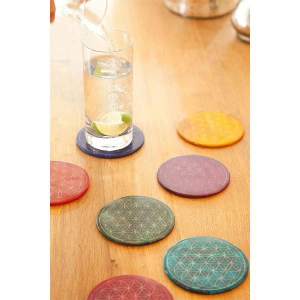 Die farbenfrohen Untersetzer aus dem Naturmaterial Speckstein verschönern jeden Tisch und jeden Raum. Durch das kraftvolle Symbol der Blume des Lebens wird daraus eine besonders harmonische und energievolle Unterlage für Gläser, Karaffen, Vasen, Schmuck und vieles mehr. Dekorativ, praktisch und wirkungsvoll!