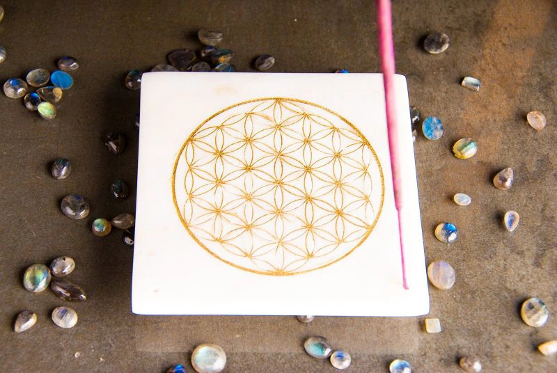 Räucherstäbchenhalter Goldene Blume des LebensFeine Eleganz aus Marmor. Dieser Stäbchenhalter ist schön massiv und mutet doch so zart an. Ob mit Holzsymbol, Goldgravur oder Intarsien - unsere Marmorhalter sind ein wahrer Blickfang! Marmor steht für Reinheit und Verwandlung zum Positiven.Marmor mit GravurL: 10 cm, B: 10 cm
