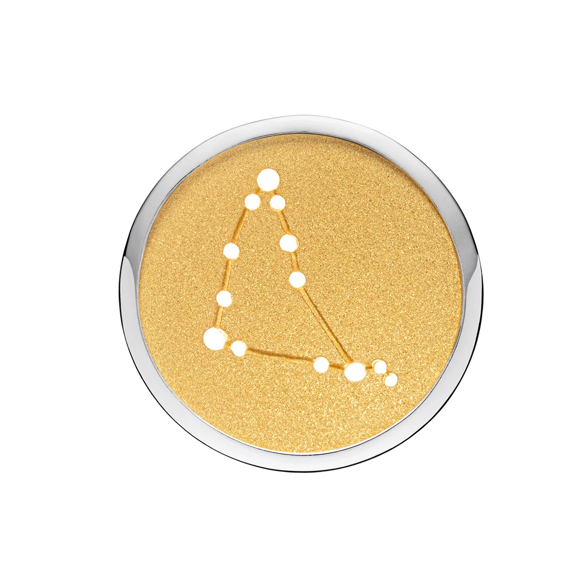 Auf einer nach innen gewölbten, matt vergoldeten Scheibe wird das Sternbild im entsprechenden Grössenverhältnis mit kleinen Bohrungen dargestellt. Die Verbindungslinien zwischen den Sternen sind leichte Vertiefungen im Material. Der äussere polierte Ring symbolisiert das Universum. Auf der Rückseite befindet sich eine Öse, durch die man eine Halskette ziehen kann. So wirkt der Anhänger, als würde er auf der Kette schweben.