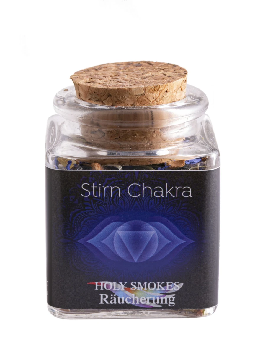 Die Stirnchakra - Chakra Räuchermischung stärkt Ihre Intuition, öffnet Sie für höhere Dimensionen und bringt geistige Klarheit. Diese Räuchermischung kann unterstützen, wenn das Stirnchakra aus der Balance ist, wenn man das Gefühl hat, für Manipulationen anfällig zu sein oder im Hamsterrad hängen zu bleiben.