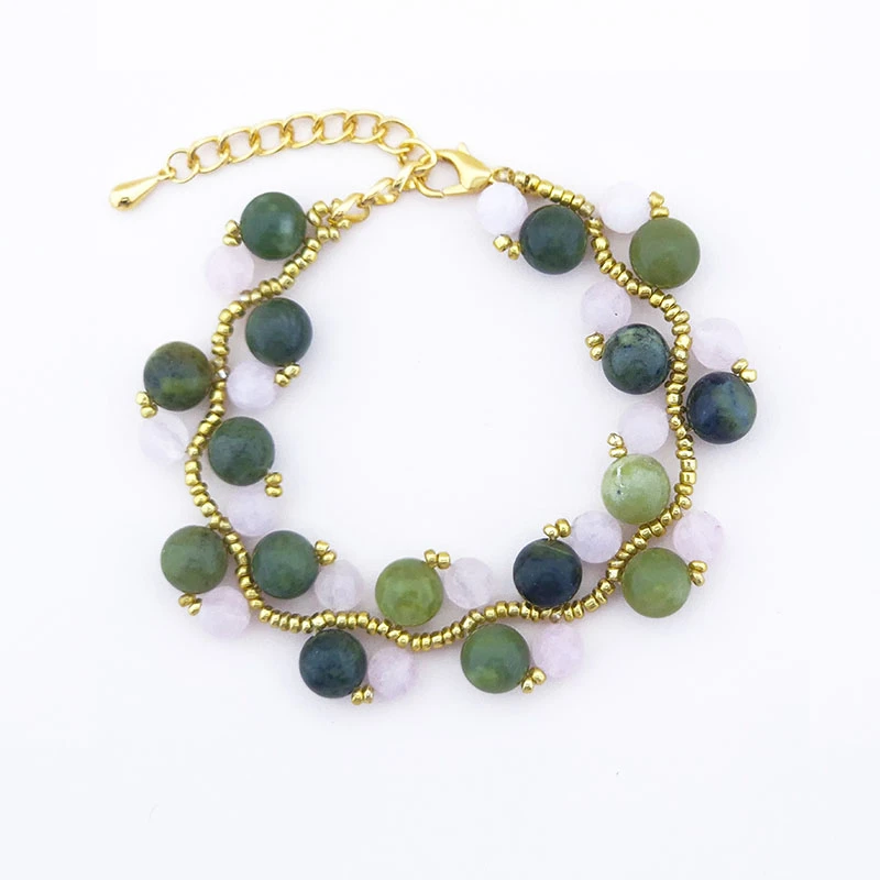 Dieses handgefertigte Edelstein-Armband, inspiriert von der Chakrenlehre, vereint die kraftvollen Eigenschaften des grünen Nephrits und des Rosenquarzes mit der filigranen Eleganz der goldenen Miyuki Rocailles Perlen.