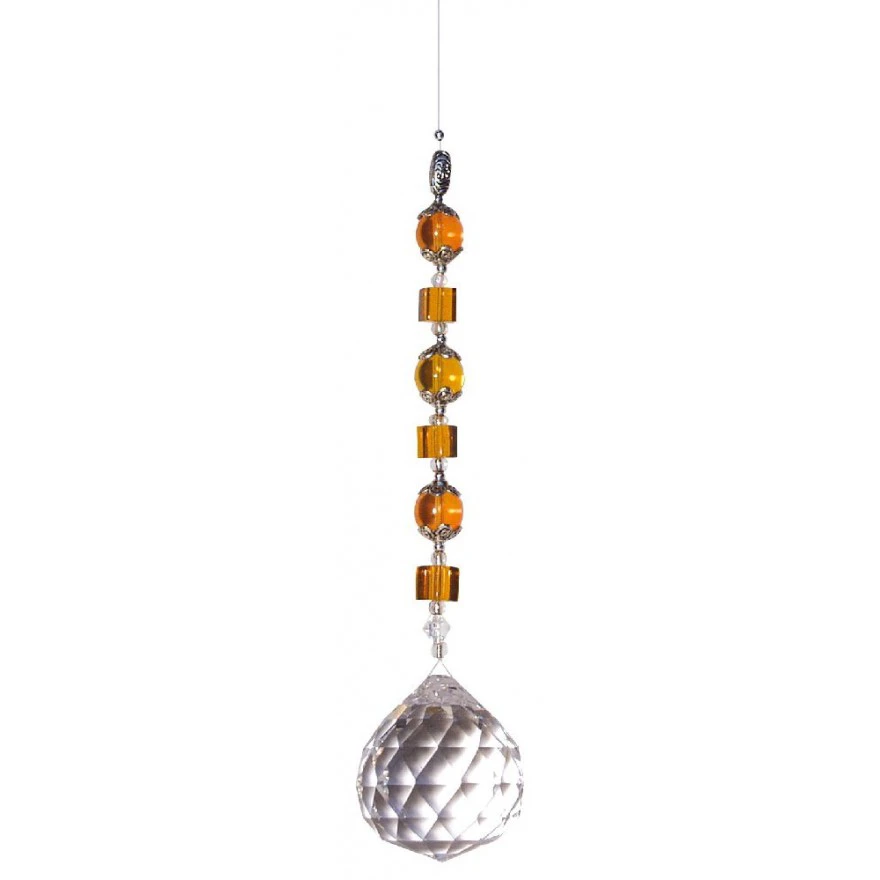 Der Suncatcher ist amberfarben gefärbt und aus Glas und Metall. Er enthält eine 40 mm grosse Bleikristall Kugel. Die Kristallkugeln von Saraswati-Design sind alle Bleikristalle. Das macht die Herstellung aufwändiger und die Kristalle schwerer – dafür schimmern sie umso mehr.