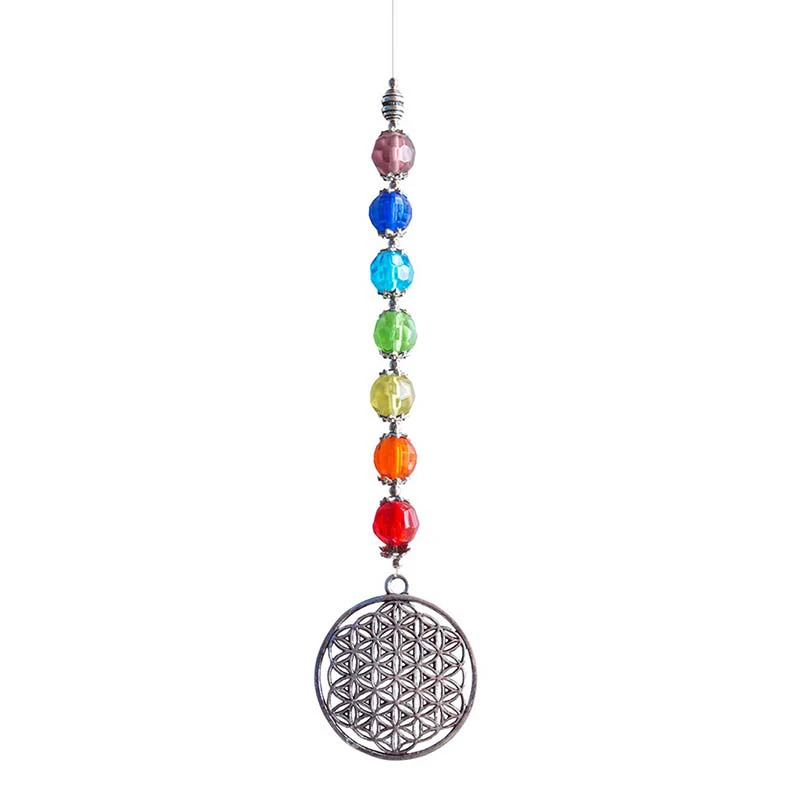 Der Blume des Lebens Suncatcher ist regenbogenfarben gefärbt und aus Kristallglas und Metall. Abgerundet wird das Produkt mit einem silbrigen Amulett/Mandala.