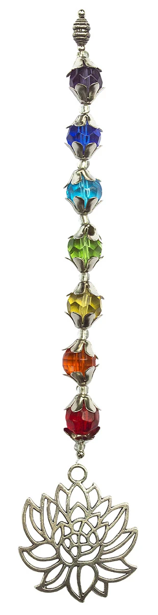 Der Lotus Suncatcher ist regenbogenfarben gefärbt und aus Kristallglas und Metall. Abgerundet wird das Produkt mit einem silbrigen Amulett/Mandala.