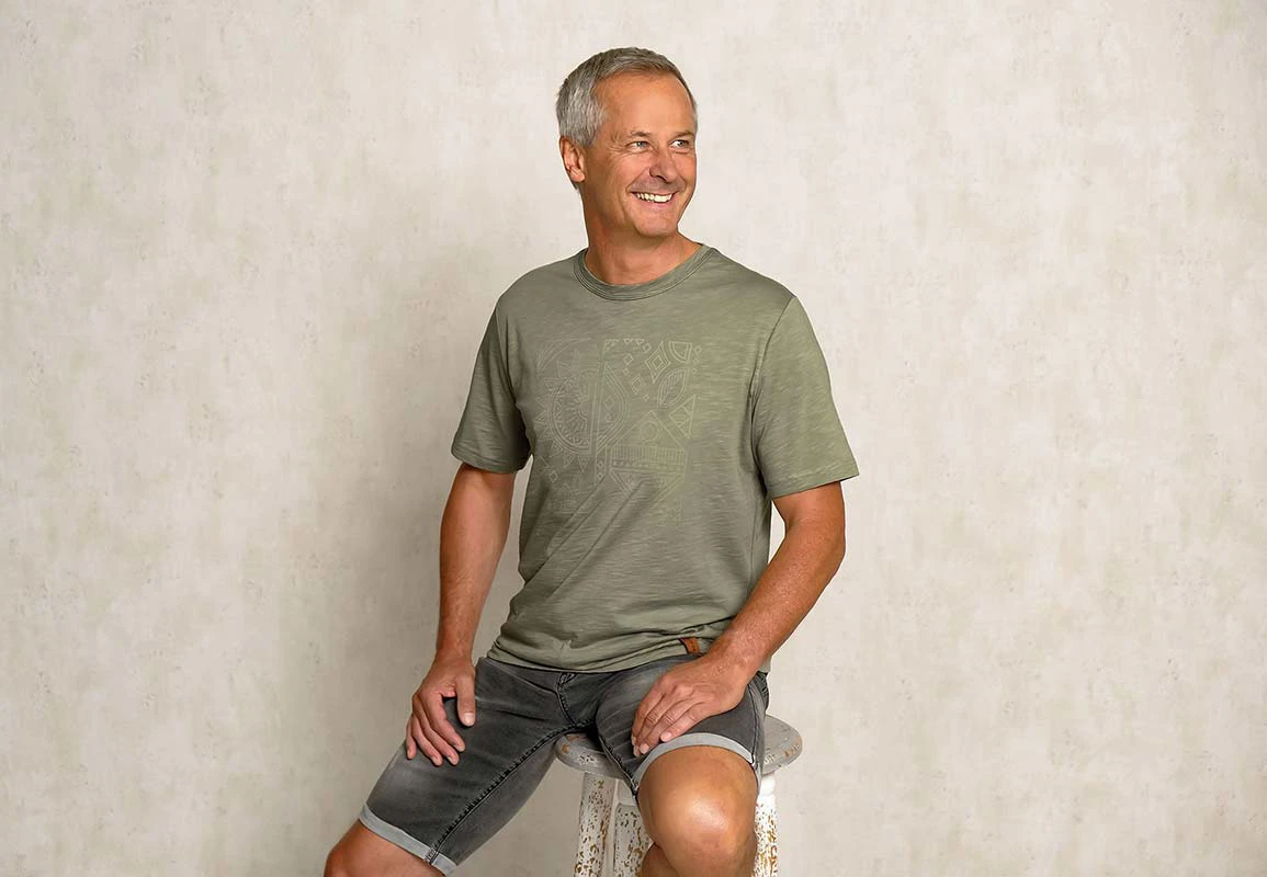 Das T-Shirt men Ethno in salbei-grün von The Spirit of OM ist angenehm zu tragen. Die erdige Farbe und der dezente Ethno-Print schenken einen schicken Style. Das sanft strukturierte Flammgarn-Material aus 100% Bio-Baumwolle hat einen besonders angenehmen Griff und fühlt sich spürbar nachhaltig an. In den Stoff wurde mikrofeiner schwarzer Turmalin eingebracht, ein Edelstein, der dabei helfen kann, negative Einflüsse abzuhalten. Turmalin eignet sind daher ganz wunderbar als Schutzstein für Körper und Seele. Im Innendruck ist eine positive Affirmation aufgedruckt.