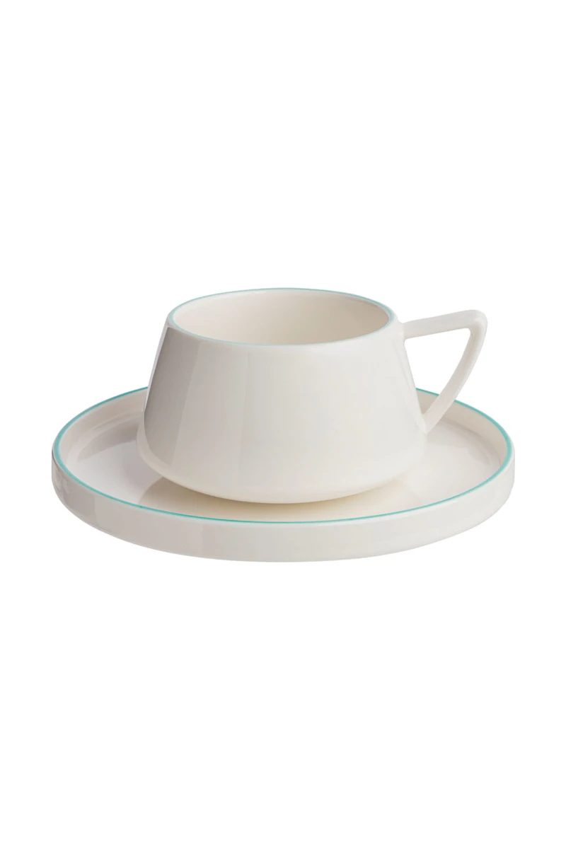 Unsere Tasse mit Untertasse und einem dezenten türkisenen Rand vereint modernes Design mit puristischer Eleganz. Gefertigt aus hochwertigem Porzellan, besticht sie durch klare Linien und eine glatte, zeitlose Oberfläche. Die Tasse überzeugt durch ihre schlichte, geometrische Form, die einen kantigen Stil mit moderner Raffinesse kombiniert. Der feine Streifen am oberen Rand der Tasse und entlang des Randes der Untertasse setzt einen harmonischen Akzent und unterstreicht das minimalistische Design. Die perfekt abgestimmte Untertasse bietet ausreichend Platz für Löffel oder kleine Beigaben und ergänzt das Set zu einem stilvollen Gesamtbild. Mit ihrer idealen Grösse ist die Tasse perfekt für Kaffee, Tee oder Heissgetränke und setzt auf jedem Tisch ein elegantes Highlight. Vervollständige deinen Stil mit unseren Lieblingsstücken aus der Serie TINTED GRACE.