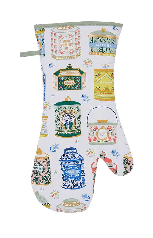 Moderne Hausarbeit trifft auf Teeliebhaber: Dieser wunderschöne Ofenhandschuh mit seinem eklektischen, handgemalten Design wird Sie dazu anregen, sich das reiche Aroma der Teeblätter vorzustellen, das Ihre Sinne erfüllt. Zeitgenössische Souvenirs voller nostalgischer Erinnerungen sind die bedeutungsvollen Objekte, mit denen Ulster Weavers seine Kunden umgeben möchte.