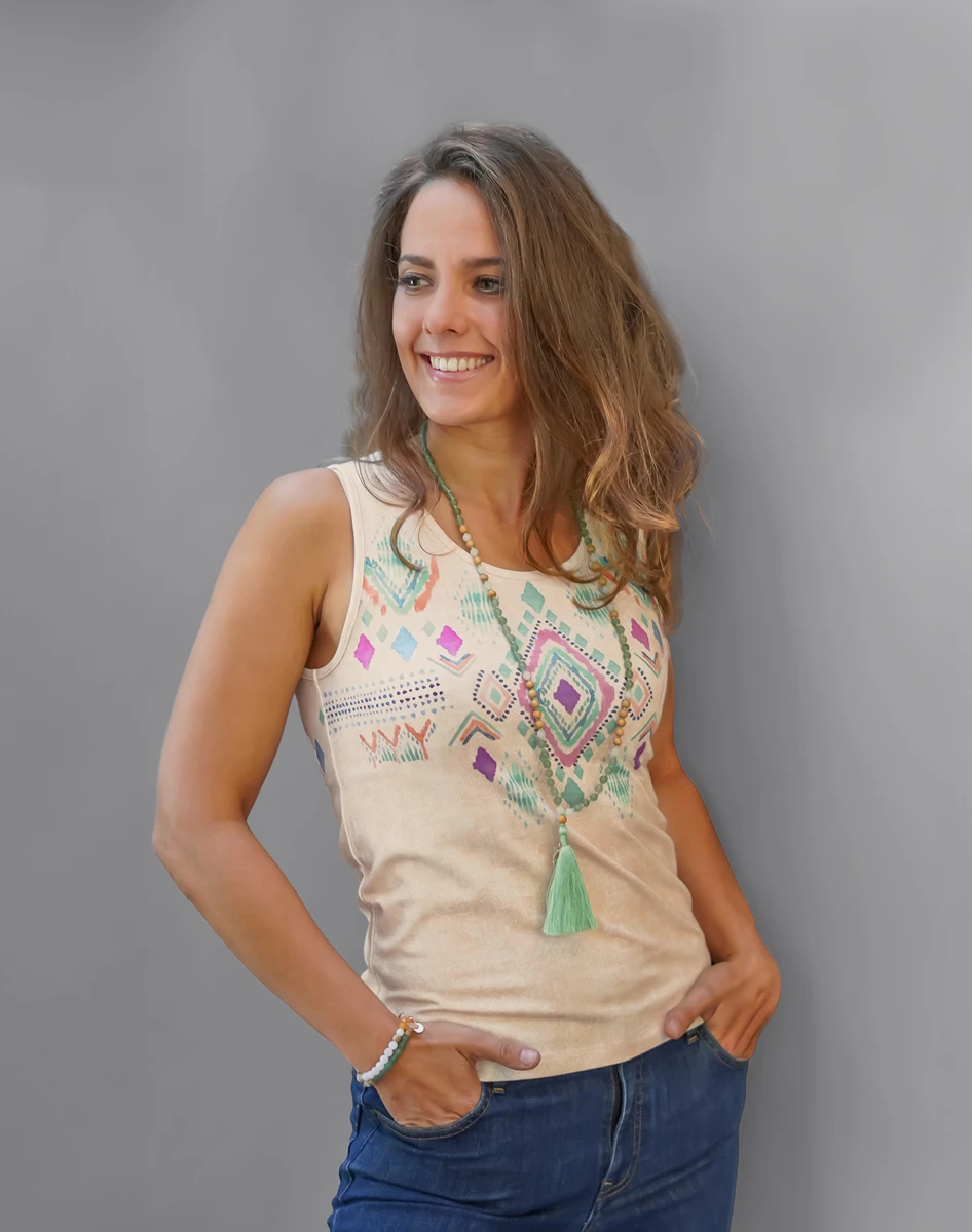 Auf der Hüfte ist ein kleines goldenes OM-Zeichen in einem Herz. In das Material wurde mikrofeiner Turmalin Edelstein eingearbeitet. Der schwarze Turmalin kann Sie dabei helfen negative Einflüsse abzuhalten und eignet sind daher ganz wunderbar als Schutzstein für Körper und Seele.