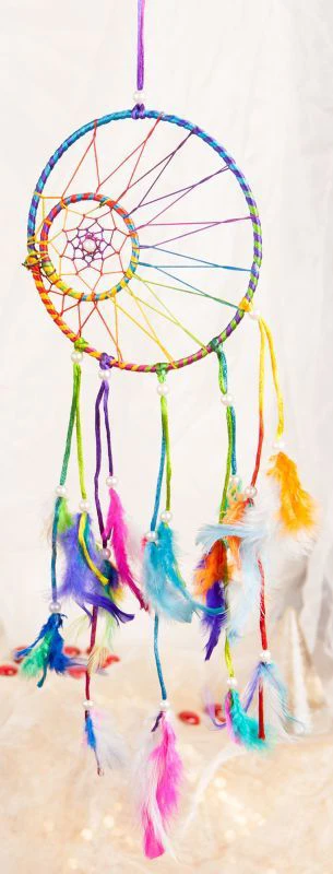 Traumfänger aus Naturmaterialien - RainbowDer Legende nach wurde die Idee des Traumfängers indigenen Indianervölkern Amerikas in Visionen übermittelt. Gesponnen wie das Netz der Spinne, wirkt der Traumfänger wie ein Filter, der böse Gedanken und Träume - wie Fremdbeeinflussung, Hass oder Manipulation - von den Guten trennt und nur das hindurch lässt, was uns Menschen hilft, den für uns richtigen Weg ungehindert zu verfolgen. Über dem Bett wirkt er als starkes Schutzsymbol, an der Wand befestigt zieht er das Chi an und freischwebend im Raum leitet und verteilt er das Chi.ø 15 cm, H: 55 cm